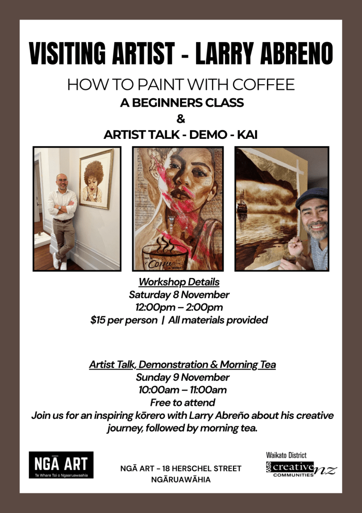 We are super excited to host visiting artist Larry Abreño for a weekend of creative inspiration and eco-conscious artmaking this November. Larry Abreño is a Waikato -based visual artist. He is celebrated for his unique approach of using coffee as a painting medium. Larry explores espresso and filter coffee. He also uses natural pigments like tea and berries to create works with rich monotones. These works have a strong emotional impact. He is known for merging sustainable art practices with cultural storytelling, often weaving themes of identity, nature, and heritage into his pieces.
